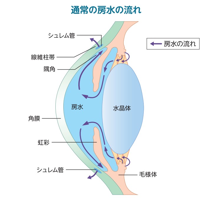 房水は毛様体(茶目)から排出されて角膜や水晶体などの組織に栄養を与えたのちに、線維柱帯を通りシュレム管から吸収されていきます。