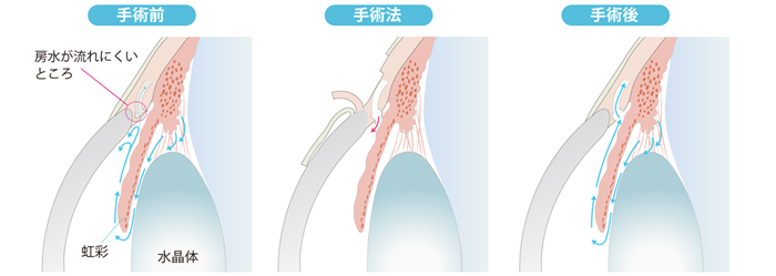 房水の排水溝の役目をしているところ(線維柱帯)を切開して、抵抗を減らすことにより房水の流れを良くすることで眼圧を下げます。
