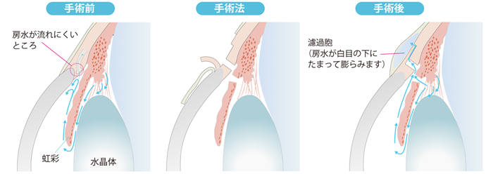 線維柱帯の一部を切除すると同時に虹彩の一部も切除し、房水を結膜の下の濾過させることで眼圧を下げます。