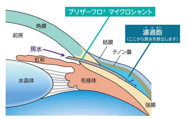 もともと目の中にある房水の流出路ではなく、あらたに流出路を作って濾過させることにより眼圧を下げます。