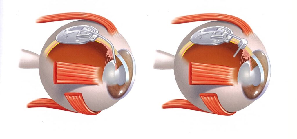 目の中にチューブを留置して房水をプレートから結膜下の眼球周囲深部に流すことにより眼圧を下げます。